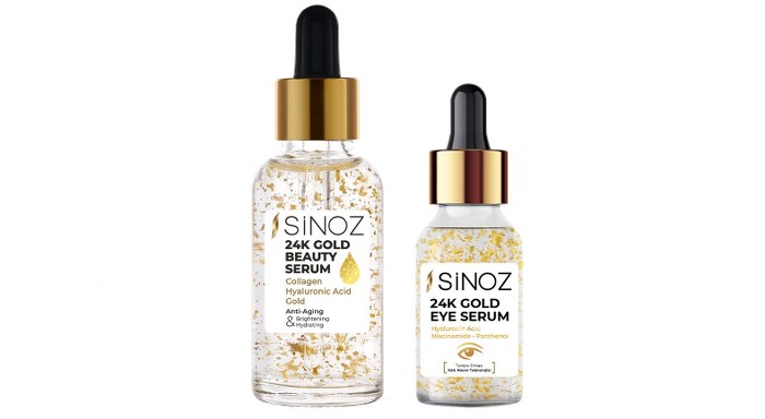 24K Altın Yüz Bakım Serumu ve 24K Altın Göz Çevresi Bakım Serumu'ndan oluşan Sinoz 2'li Altın Serum Seti ile yüzünüzün ve göz çevrenizin ihtiyacı olan bakımı sağlayın.