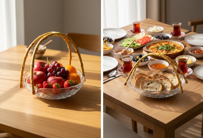 Dalga ve kabartma desenli cam yüzeyi sayesinde sunumlara zarafet katan Bambum Cestino, dikdörtgen ve yuvarlak formunun sağladığı geniş kullanım alanıyla tatlılardan kahvaltılıklara, atıştırmalıklardan özel ikramlara kadar pek çok yiyeceğe uyum sağlıyor.