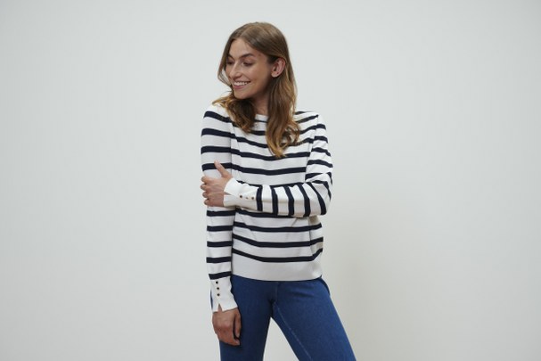 Günlük görünümleri oluşturmak için ideal çizgili hırka, modern ve klasiği bir araya getiren tasarımıyla öne çıkıyor.