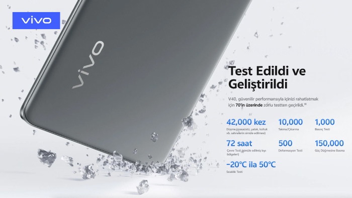 Cihaz, toza ve suya dayanıklılığın ötesine de geçiyor. 70 zorlu kalite testinden geçerek vivo'nun bugüne kadar ürettiği en sağlam akıllı telefonlardan biri olan V40, çok ince yapısına rağmen sert darbelere karşı da koyabiliyor. Çerçeve yapısının dayanıklılığı 500 deformasyon testiyle kanıtlanan cihaz; masa üstü, yatak ve koltuk gibi çeşitli sahneleri simüle eden testlerde 42.000 kez düşürülerek dayanıklılığını ortaya koydu.