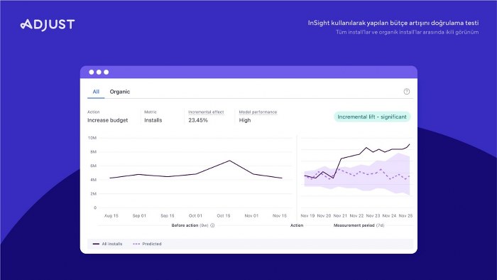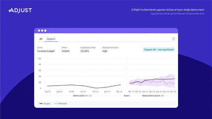 Adjust InSight ile pazarlamacılar artık bütçe artışları gibi pazarlama kararlarının yatırım getirisi üzerindeki etkisini ölçümlemekte artımlılık (incrementality) analizini kullanabiliyorlar ve bu sayede yatırım getirisine katkı sağlamak için aldıkları kararların hedef KPI'ları üzerindeki etkisini kolaylıkla analiz edebiliyor, artımlı bir yükseliş sağlayıp sağlamadığını görebiliyor ve organik unsurlar üzerindeki etkisini ölçümleyebiliyorlar.