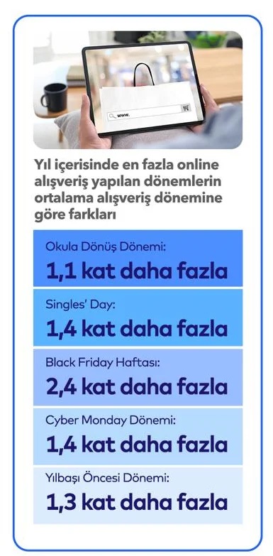 Ortalama sepet tutarındaki en yüksek harcama 941 TL ile “Black Friday” haftasında yapıldı. Bu dönemi ortalama 850 TL sepet tutarı ile “Single’s Day” izledi. Kitap ve kırtasiye ürünlerinin düşük maliyetleri nedeniyle, okula dönüş haftası diğer özel günler arasında ortalama 566 TL sepet tutarı ile en düşük harcama yapılan dönem olarak kaldı.