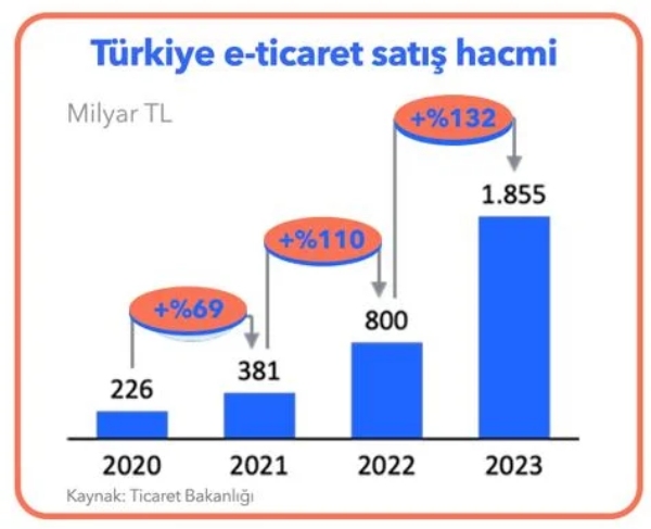 Pandemi sonrası, 2021 yılına geçerken yüzde 69 olan Türkiye e-ticaret satış hacminin büyüme oranı bir sonraki yıl yüzde 110 olarak gerçekleşmişti. 2023 yılında ise yüzde 132 büyüyen e-ticaret sektörünün satış hacmi 1.855 milyar TL’ye ulaştı.