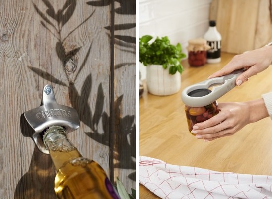 Kavanoz ve şişe açacağı, farklı boyutlarda kapaklar için kullanılabilen bir tasarıma sahipken duvara monte açacak ise outdoor kullanımı için ideal.