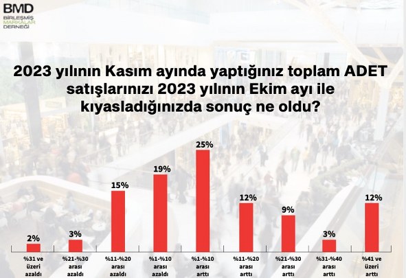 Birleşmiş Markalar Derneği (BMD) Başkanı Sinan Öncel, Kasım ayında üye markaların yüzde 61’inin adet satışları artarken, yüzde 39’unun gerilediğini bildirdi.