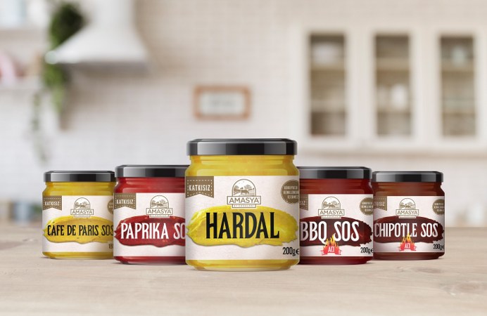 Amasya Et Ürünleri’nin sos grubu içinse minimalist bir tarzda tasarladığımız ambalajla ürünün katkısız içeriğini öne çıkarmayı hedefledik. Tasarımımızı oldukça küçük bir yüzey üzerinde oluşturmamıza rağmen ambalajın raflardaki güçlü duruşu hemen göze çarptı.