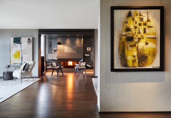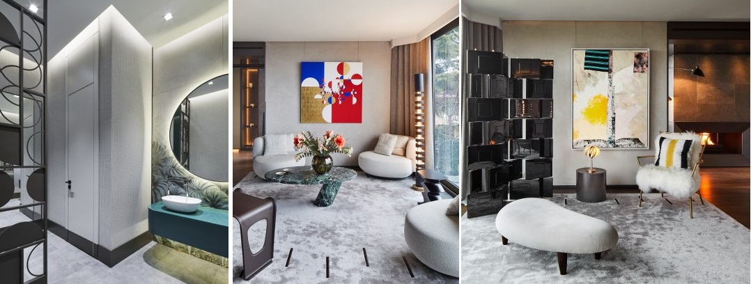 İkonik mobilya parçaları kullanılarak, ev sahibinin hayranlık uyandıran sanat eseri koleksiyonu için zarif bir atmosfer oluşturacak şekilde tasarlanmış olan evin büyük salonun tam ortasında yer alan iki sütun, mekandaki üç bölümün ayırıcısı olacak şekilde planlanmış.
