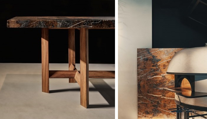 Öne çıkarılmak istenen alanlarda mermer kullanılmış, binlerce yıl içinde oluşmuş bu doğal taş ile yemek yapmanın sürecine dayanan ortak bir bağ yaratılmış.