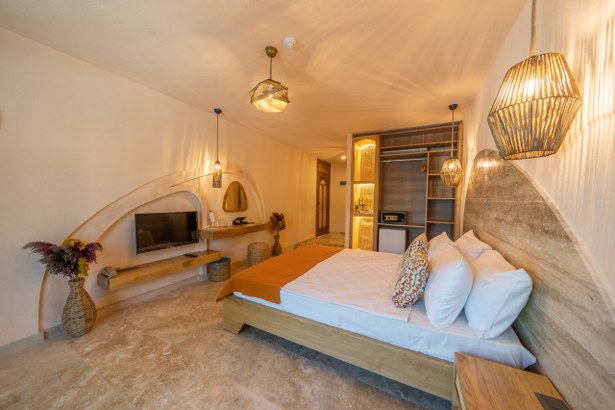 Odalarda da devam eden bu anlayışla yatak başlarında doğal taş traverten, yatak altlığı, konsollar, dolap ve kapılarda ise elli yıllık ahşaplar kullanılmış.