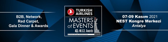 Etkinlik ve turizm sektörünün devlerini, 7-9 Kasım 2021 tarihlerinde Antalya NEST Kongre Merkezi’nde Turkish Airlines ve TOBB- Antalya Ticaret ve Sanayi Odası destekleriyle gerçekleşecek Masters of Events by ACE of M.I.C.E. Awards organizasyonunda buluşturacak