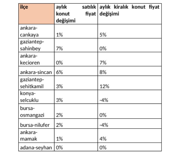 Bir önceki aya göre Türkiye genelinde kiralık fiyatlarında %10’luk, satılık fiyatlarında ise %1’lik bir artış gözlemlenmiyor.