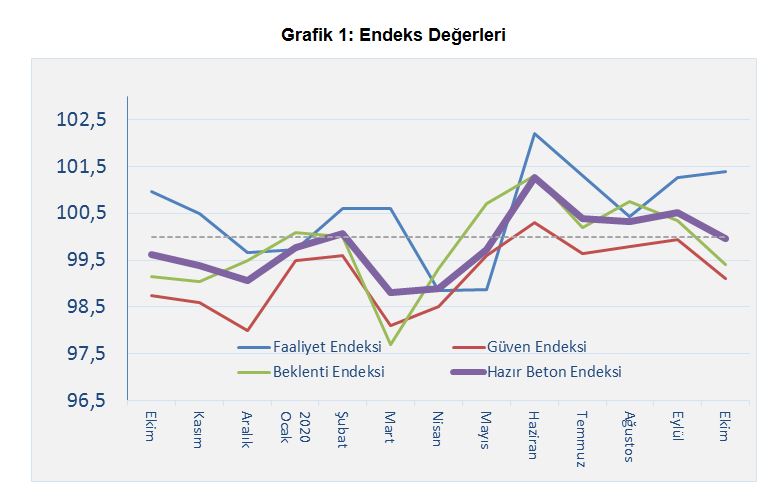 teşebbüslerin, ekonomi ve sektöre yönelik duydukları güven seviyesi, Hazır Beton Beklenti Endeksi ile hazır beton firmalarının önümüzdeki üç aylık dönemde faaliyetlerinin hangi seviyede olacağına ilişkin beklentiler hakkında bilgi ediniliyor. Hazır Beton Endeksi ile endekslerin tümünü içeren bileşik endeks elde ediliyor.