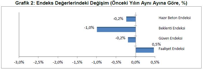 Güven endeksi de eşik değerin hemen üstüne çıkmıştır. Güvendeki yükselmeye rağmen beklentinin en düşük değere sahip endeks olarak kalması dikkat çekicidir. Birleşik Hazır Beton Endeksi, faaliyet ve güvendeki artış ile birlikte yükselmiş ancak eşik değerin hemen altında kalmıştır.