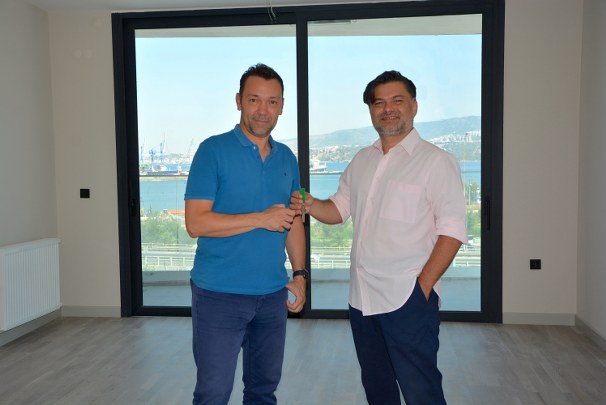 Yatırımcıların örnek daireyi gezerek tam not verdiklerini belirten Satış ve Pazarlama Yöneticisi Cem Tekoral, projeden ev alan Serkan Yılmaz'a anahtarlarını teslim etti.
