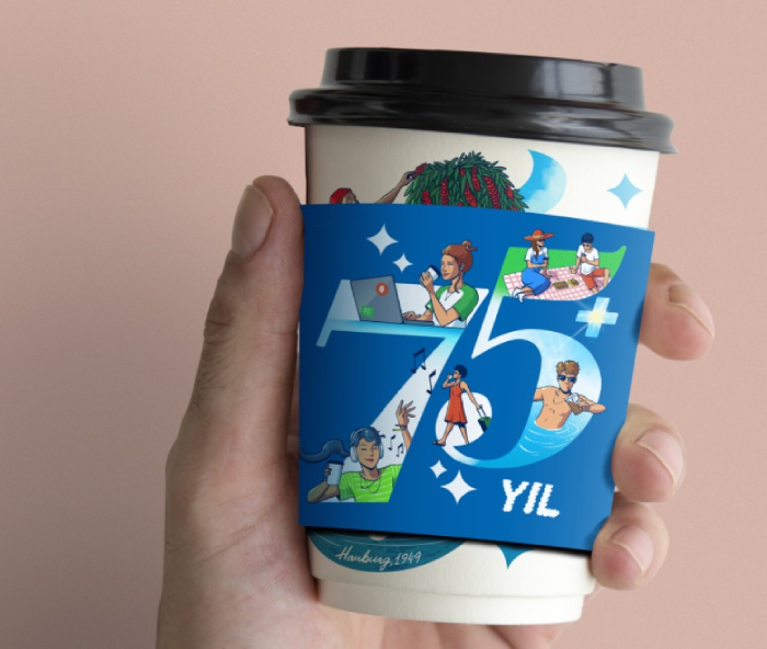 Yıl dönümüne özel tasarlanan bardakta, Tchibo'nun kahve tutkusu ile geçen 75 yılı aşkın hikayesi görsel bir dille anlatılıyor. Kahve ağaçlarından kahve toplayan kadın figürü, markanın kahveyle başlayan yolculuğunu simgeliyor. Hamburg'daki ilk mağazanın tasviriyse, Tchibo'nun Almanya'dan dünyaya yayılan serüvenini bardağa taşıyor.